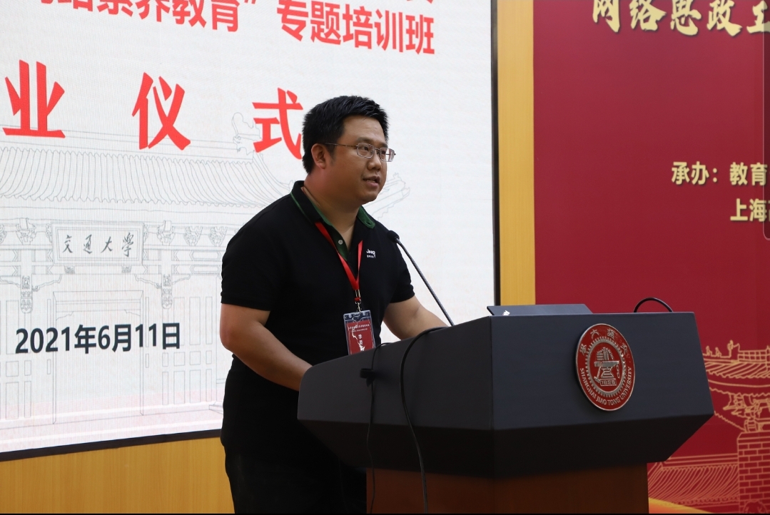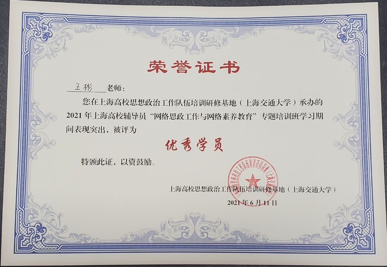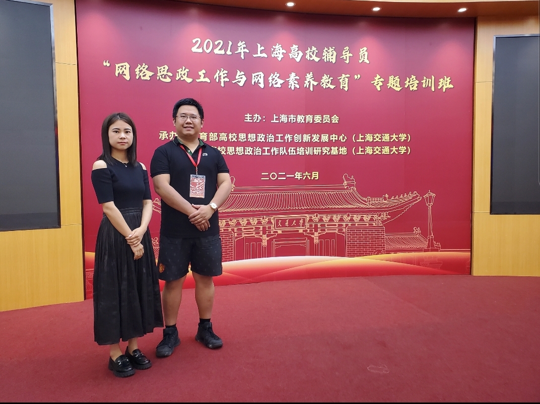 6月8日-11日,学生处王彬老师、信息技术与机电工程系庄淑珺老师参加上海交通大学(上海高校思想政治工作队伍培训研修基地)举办的2021年上海高校辅导员“网络思政工作与网络素养教育”专题培训班。学生处王彬老师荣获网络思政工作与网络素养教育专题培训“优秀学员”荣誉称号,并代表高职类院校就“网络思想政治教育实践”进行结业汇报。