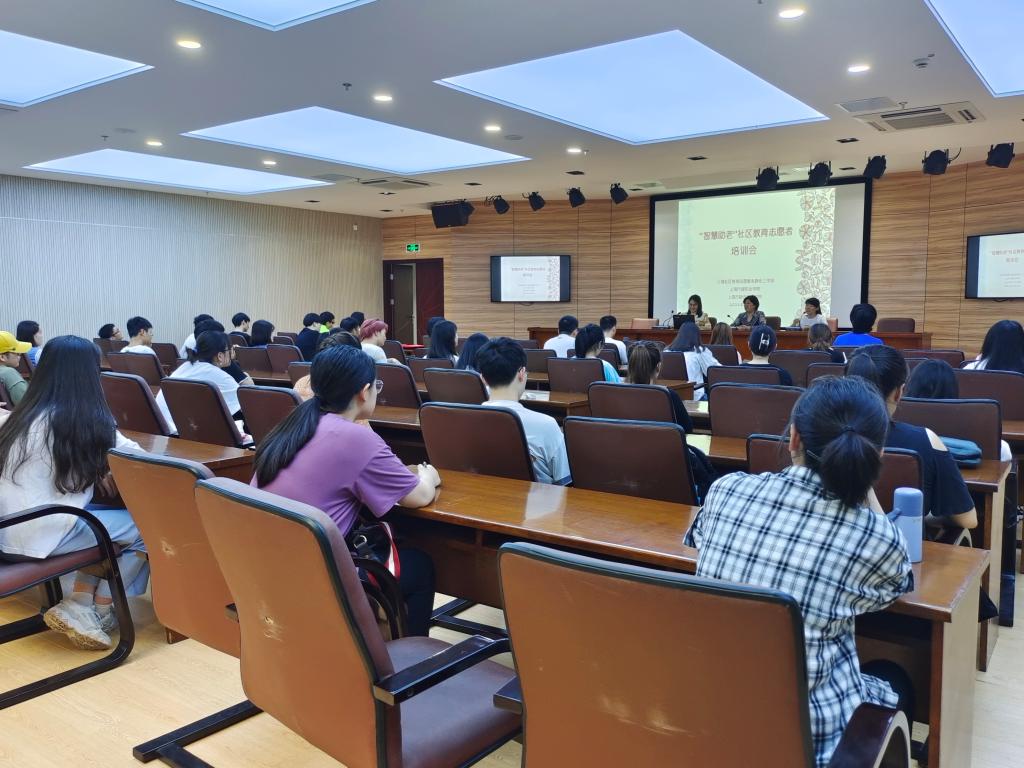 6月18日下午,社区教育志愿者队伍培训在敏行楼2213室召开。学院继续教育部主任骆海英、静安社区学院社教部主任杨玉明、志愿者项目金子旸、顾倬麒老师,继教部工作人员及50名学生参加此次会议。会议由继教部教师王明慧主持。