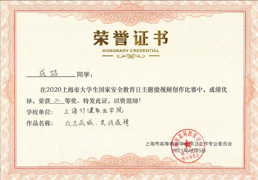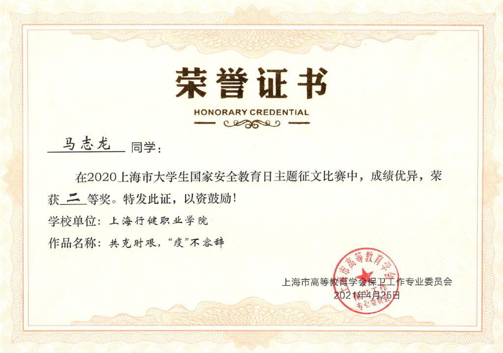 为引导全市大学生深入贯彻落实总体国家安全观,广泛普及国家安全知识,提升大学生的国家安全意识与爱国热情,在上海市教委的指导下,高校保卫学会在2020年4·15国家安全主题教育日期间组织开展了上海大学生国家安全教育日系列活动,全市六十余所高校参与,我院学生喜获两个二等奖,其中商务外语系余燔老师指导的19级少儿英语2班成喆同学共同拍摄完成的微视频作品《众志成城,共战疫情》,荣获2020上海市大学生国家安全教育日主题微视频创作比赛二等奖;19级经济管理系马志龙同学的征文作品《共克时艰,‘疫’不容辞》在2020上海市大学生国家安全教育日主题征文比赛中荣获二等奖。