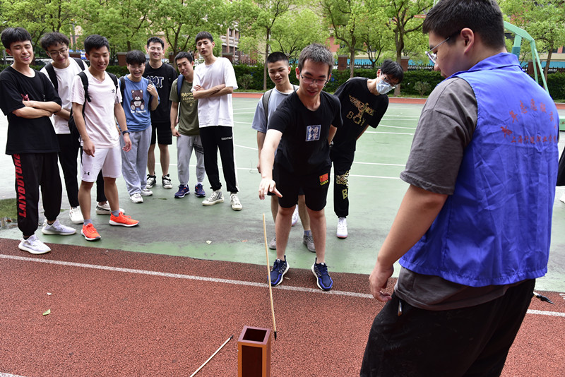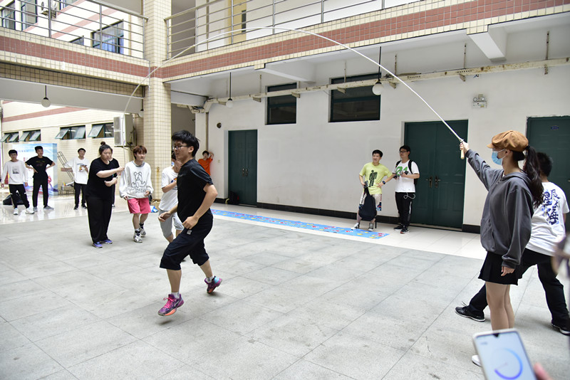 此次活动设有传统体育运动项目,包括投壶、滚铁圈、跳长绳、踢毽子等,同时也设置了团队趣味体育运动,包括呼啦圈过山车、手脚并用等项目。活动共有六支队伍,每个队伍10人,同学们在对抗赛中挑战自我,团队协作,各组配合默契,享受着比赛的快乐。活动中,滚铁环的同学把铁环驯服得得心应手。踢毽子的同学们全神贯注地盯着翻飞的毽子,抬脚接毽,落脚无误,游刃有余,引来阵阵喝彩。最精彩的是跳长绳,大家齐心协力,绳舞飞扬,深切体会到团结合作的重要性。