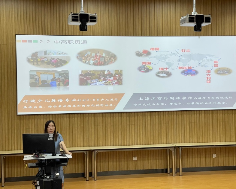 在教师交流环节,少儿英语专业组长宋婕老师呈现了专业八年来的发展情况,在师资融通、课程共建、教学见习实习等方面与企业开展深度校企合作,形成“英语+少儿英语教学技能+教学管理”的专业特色,并与上海工商外国语学校进行中高职贯通人才培养。软件技术专业组长东苗率先开展了1+X证书试点,师生参加职业技能大赛斩获多项奖项,软件技术专业还与上海信息技术学校开展大数据应用与管理的中高职贯通培养,在校企合作、院级优质课程建设等方面也取得了一定成绩。