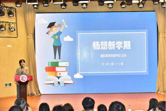 晚会在朗诵《起航》中拉开序幕。紧接着,信机系主任王莹老师从专业发展、职业选择方向出发,为21级新生上了一堂思政课。王老师向新生详细讲述了信机系人才培养特色,展示了优秀毕业生的风采,提出了新阶段的期望和要求。要求大家一是培养良好的学习习惯,二是培养自己的规划意识,三是树立目标并为之努力,希望大家能够在接下来的两到三年时间里扎实学习、学有所成,在行健度过一段充实、美好的时光。