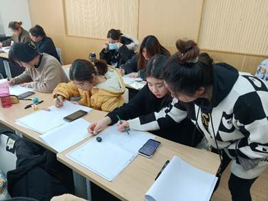 交流中,来访的三位老师进入少儿英语专业的课堂进行听课。其中,姜妹老师的语音课上课形式新颖,用读小说的方式带学生学习语音知识,把枯燥的语音课上得有声有色。来访老师表示,将会借鉴该课程好的经验和方法进行授课。在简笔画辅助教学课堂上,丁梦菲老师直接上手和学生一起画图,进行沟通交流。