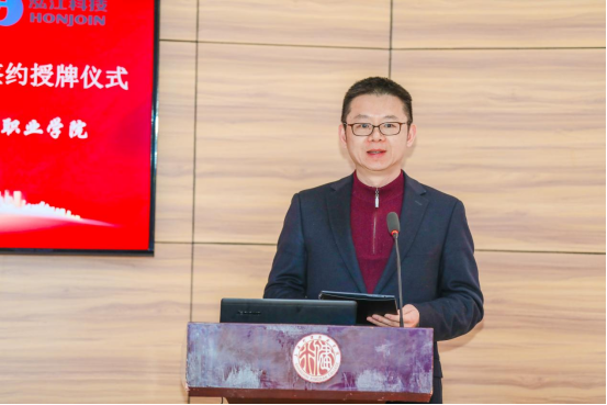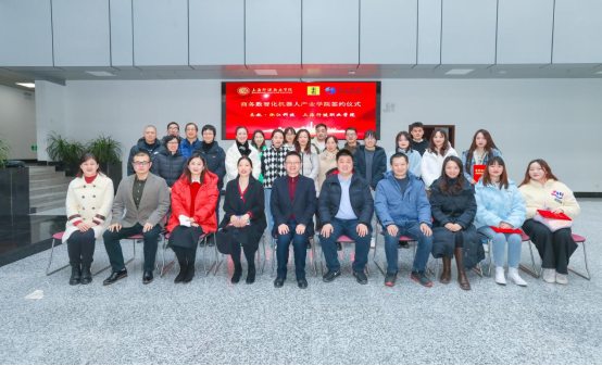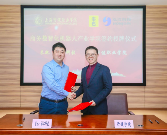 上海泓江信息科技有限公司董事长楚万文、上海行健职业学院院长黄群为此次商务数智化机器人产业学院进行签约揭牌。
