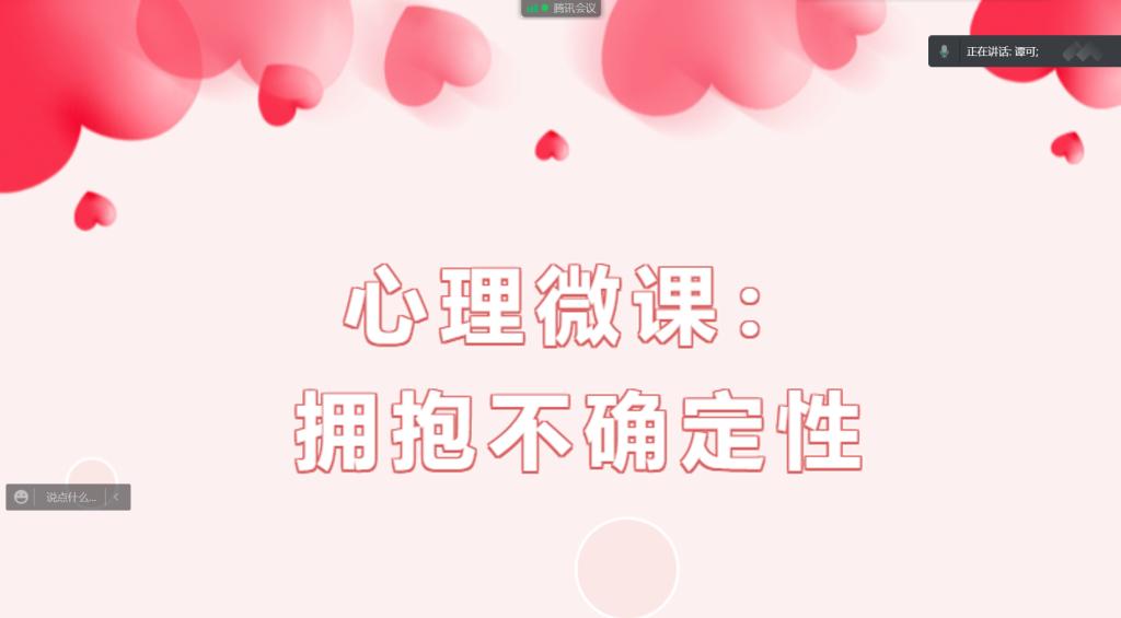 随后,谭可书记又为全系教职工开展了心理微课:拥抱不确定性。她表示,在疫情防控特殊时期,不确定性是常态,要试着接纳不确定性,找到自己能控制的部分,必要时可以寻找专业机构帮助。