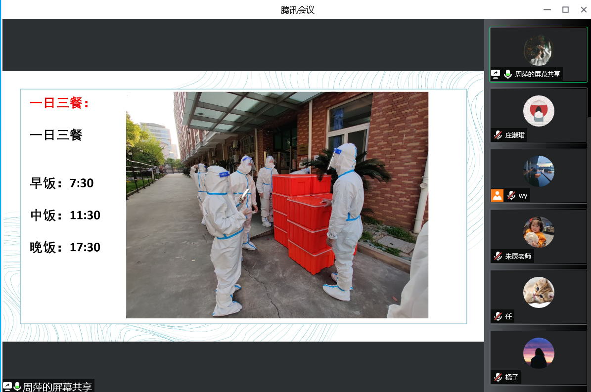 会上,辅导员周萍老师首先介绍了自己在学校西区一线抗疫工作内容,包括每天三餐的发放,抗原、口罩等防疫物资的发放,帮助学生配药,关注学生心理健康等。从最初的临危受命、物资紧张,到后续各项工作摸排清楚,有序开展,所有的值班老师、学生志愿者都付出了很多。此外,周萍老师还是四个班级的辅导员,所以她也极力做好学生日常管理和对学生的关心工作。周萍老师总结道:“我做的事情虽然简单又琐碎,但却非常重要,守好学校,需要我们每个人的用心付出。我深深感受到,只有具备责任心、爱心、耐心和不惧风险的勇敢之心才能更好助力我做好一线抗疫的各项工作。这期间,也特别感谢在困难时候相互帮助的同事,致敬每一位坚守岗位的行健人。”