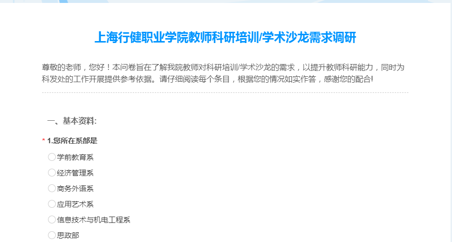 本次调研工作自2月中旬开始策划,3月10日正式发放“上海行健职业学院教师科研培训/学术沙龙需求调研问卷”,历时一个月完成问卷数据分析、调研分析报告。学院共156名教师参与调研,调研人群系部分布齐全,能够全面反映学院的科研现状。问卷所反映的教师科研培训/学术沙龙需求及建议,主要集中在内容、形式、工具等方面,科发处针对问卷中反映的问题采取了一系列解决措施。