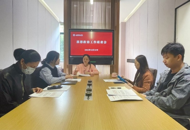 10月25日,学院召开思想政治工作联席会,学院党委书记沈燕华出席会议并讲话。党办、宣传部、思政部、团委等部门负责人参加会议。会议共同学习了共青团中央、中共教育部党组《关于改革创新高校共青团工作切实增强思想政治引领实效的若干措施》文件精神,听取了各部门近期思政工作的开展情况,就推进学院“大思政”工作格局发展进行部署。