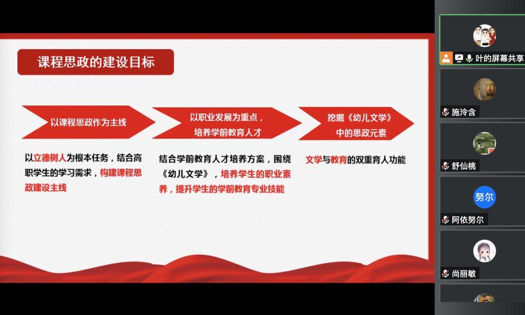 在学院的高度重视和学前教育系教师的大力支持下,学前教育系于2016年起与喀什职业技术学院学前教育专业开展对接帮扶工作,近几年来,学前教育系积极组织策划各项富有实效的对接帮扶活动。为加强交流,助力双方学前教育专业师资教学教研能力和课程思政建设能力的提升,近日,学前教育系举办了“课程思政建设交流会”,学前系主任李娜、学前系全体教师及喀什职业技术学院的教师们一同参加此次交流。