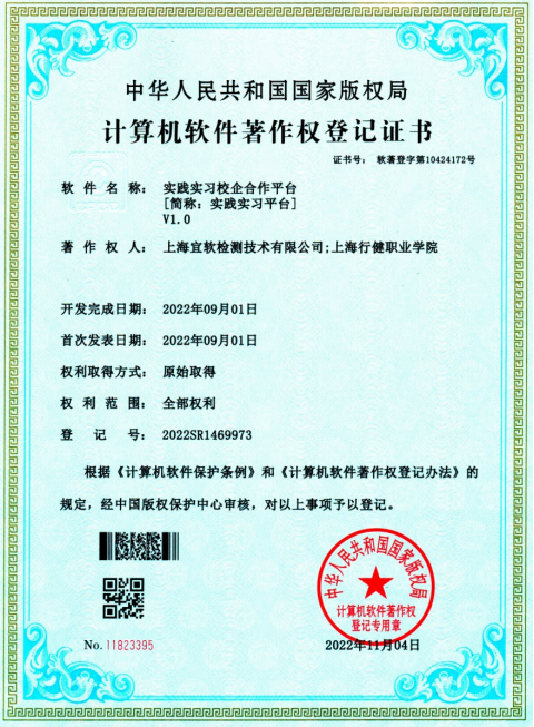 近日,学院“校企合作实践实习平台”获得中华人民共和国国家版权局颁发的《计算机软件著作权登记证书》,该项成果由学院信息技术与机电工程系孙富菊老师与上海宜软检测技术有限公司共同研发,校企共享著作权。