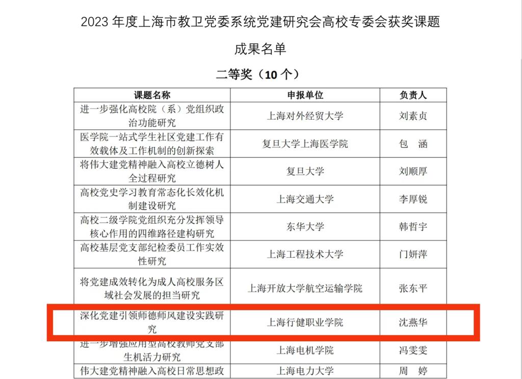 近日,上海市教育卫生党委系统党建研究会公布了2023年度党建优秀课题研究成果。经党建研究会各团体会员单位层层把关、择优选送,共提交课题成果296 项,经评审,最终推选出优秀成果93项,其中一等奖5个、二等奖26个、三等奖62个。我校党委书记沈燕华主持的课题《深化党建引领师德师风建设实践研究》荣获2023年度上海市教卫党委系统党建研究会课题成果三等奖,同时获上海党建研究高校专委会课题成果二等奖。
