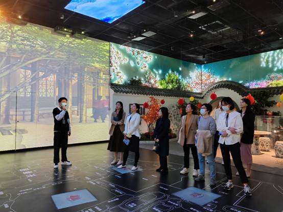 会后,在馆方邢青总监和金牌讲解员刘伟华带领下,老师们参观了以“时空穿越、全景园明”“六合太平、满汉全席”“天工开物、陶瓷长廊”等命名的9大展区,老师们通过多媒体交互等技术模拟体验了文物二次创作、青铜铸造、瓷器烧制等项目以及元宇宙数字藏品的收藏分享功能。
