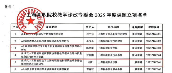 根据《上海高职院校教学诊断与改进专家委员会关于公布2025年度课题立项名单的通知》,我校2项课题成功立项。信息学院院长陈品华主持的“AI赋能高职院校专业建设质量监测体系构建及实践路径研究”获批重点课题,科发处许婧老师主持的“生成式人工智能驱动下上海高职院校科研绩效动态评估模型构建与应用研究”获批一般课题。