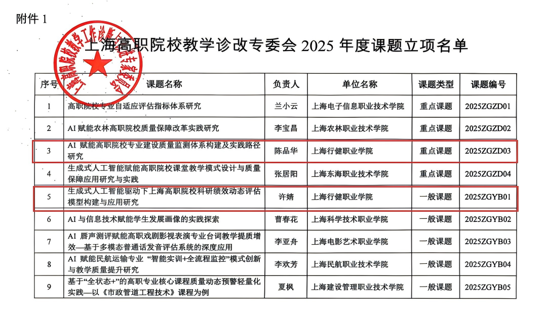 根据《上海高职院校教学诊断与改进专家委员会关于公布2025年度课题立项名单的通知》,我校2项课题成功立项。信息学院院长陈品华主持的“AI赋能高职院校专业建设质量监测体系构建及实践路径研究”获批重点课题,科发处许婧老师主持的“生成式人工智能驱动下上海高职院校科研绩效动态评估模型构建与应用研究”获批一般课题。