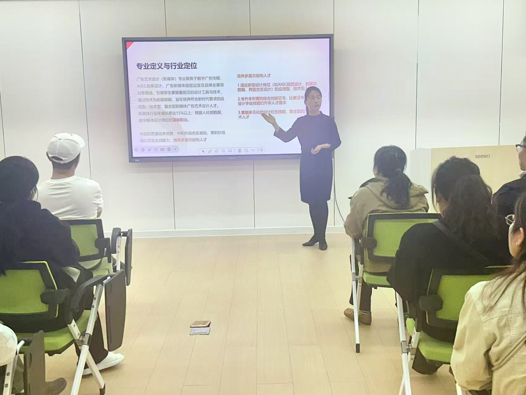 会议开始,中职校校领导介绍中职校基本情况,教务处主任解读中高贯通学籍管理办法。随后,创意学院骆海英院长介绍学校与创意设计学院贯通专业基本情况。她重点围绕中高贯通 “衔接性、实践性” 核心特点介绍了办学优势,表示创意学院为学生提供 “课堂-实训-企业实习”一体化培养模式,同时明确高职阶段将更侧重岗位能力培养,通过企业真实项目驱动教学,帮助学生提前适应行业节奏,为毕业就业或技能提升筑牢基础。