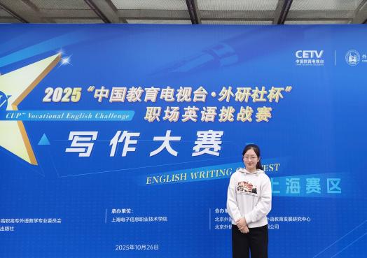 2025年“中国教育电视台•外研社杯”职场英语挑战赛写作大赛上海赛区比赛于10月26日在上海电子信息职业技术学院顺利举行。在基础教育学院马小雅老师的专业指导下,学生薛雨晴凭借扎实的英语写作功底与出色的临场发挥,一举斩获上海赛区一等奖的优异成绩。而在11月2日,演讲大赛上海赛区比赛于上海旅游高等专科学校圆满落幕,基础教育学院成慧钰老师指导的学生朱欣雨同样表现出色,凭借极具感染力的演讲风格与与扎实深厚的语言功底,荣获上海赛区一等奖。