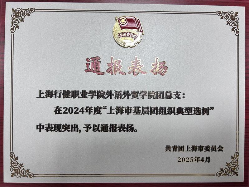 2025.05.11喜报!外语学院团总支荣获2024年度“上海市基层团组织典型选树”通报表扬上海市基层团组织典型选树工作,是以习近平新时代中国特色社会主义思想为指导,坚持大抓基层的鲜明导向,全面推进团的基层组织建设,强化典型示范引领作用,推动新时代基层团建高质量创新发展的重要举措。近日,共青团上海市委公布了2024年度上海市基层团组织典型选树表扬名单。我校外语学院团总支在2024年度“上海市基层团组织典型选树”中表现优异,荣获通报表扬。外语学院团总支书记陈曌获得个人通报表扬。外语学院团总支在工作中始终注重加强团员政治教育和青年思想政治引领,组织团员青年深入学习贯彻习近平新时代中国特色社会主义思想和党的二十届三中全会精神,在坚持理论学习的同时创新学习形式,力图提升青年学习成效,学院20