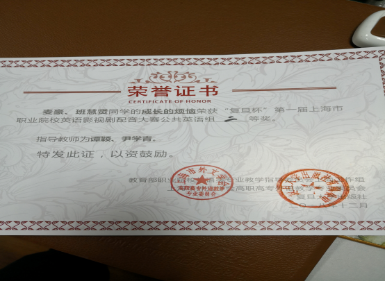 2018年12月14日下午,应用艺术系17环艺1班的班慧贤同学和信机系18级的麦豪同学组队,参加了在上海工商外国语学院举行的“复旦杯”第一届上海市职业院校英语影视剧配音大赛的决赛,获得公共英语组二等奖,尹学青老师作为艺术系学生指导教师也全程参与了此次活动。