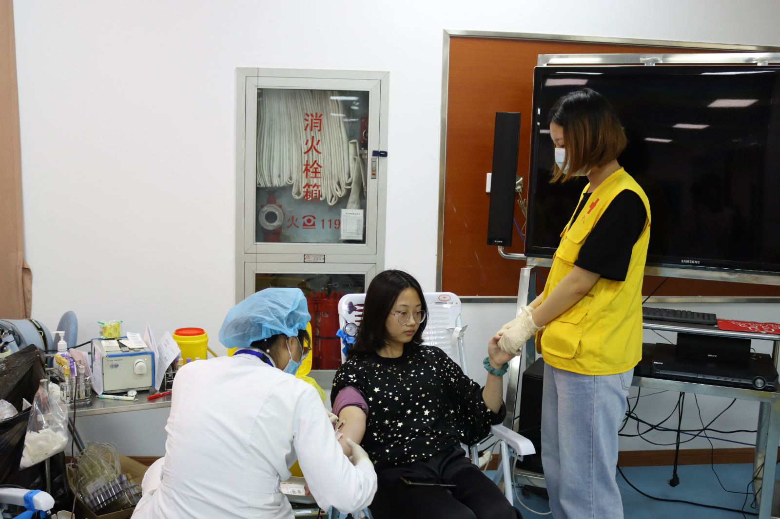 献血现场,应用艺术系学生在现场有序排起长队,通过体温测量、扫描健康码后,进行血液检测、采血。工作人员为献血的同学们准备了食品补充能量,保障采血过程安全可靠。