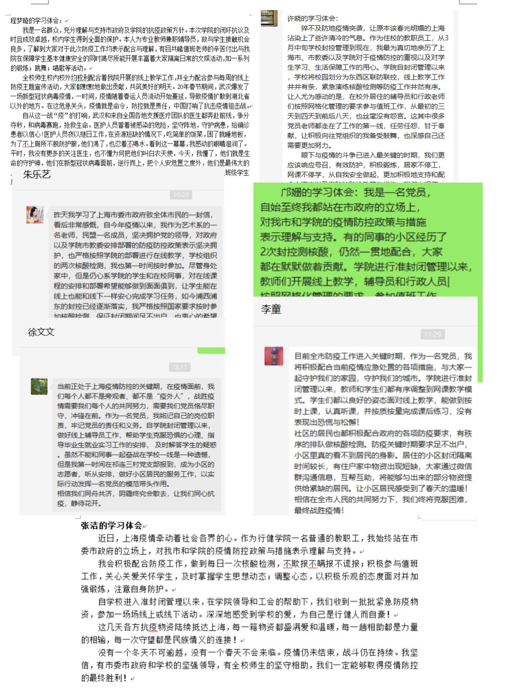 通过学习,教职工认识到,上海作为一个拥有2500万常住人口的超大城市,要顺利完成全员核酸筛查、早日打赢疫情防控阻击战,离不开每一位市民朋友的支持配合。市委市政府给为抗疫而努力的每一个我们带来安心与感动大家都相信,坚持就是胜利,我们必将战胜疫情拥抱春天。 (艺术系 邝姗