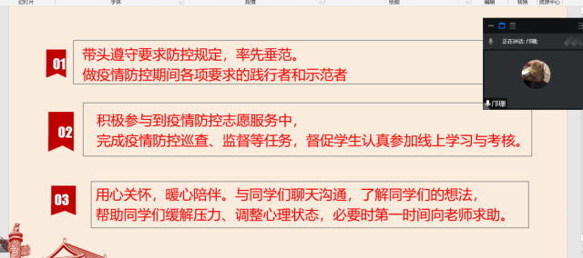 首先,支部书记邝姗老师介绍了当前学院疫情防控平稳有序,整体态势向好。这得益于学院师生齐心、共克时艰的坚定信心与行动。目前,正值疫情防控最后的关键时刻,支部号召团学干部身先为范,在学院疫情防控统一部署下,为筑牢校园疫情安全防线、贡献青春力量。