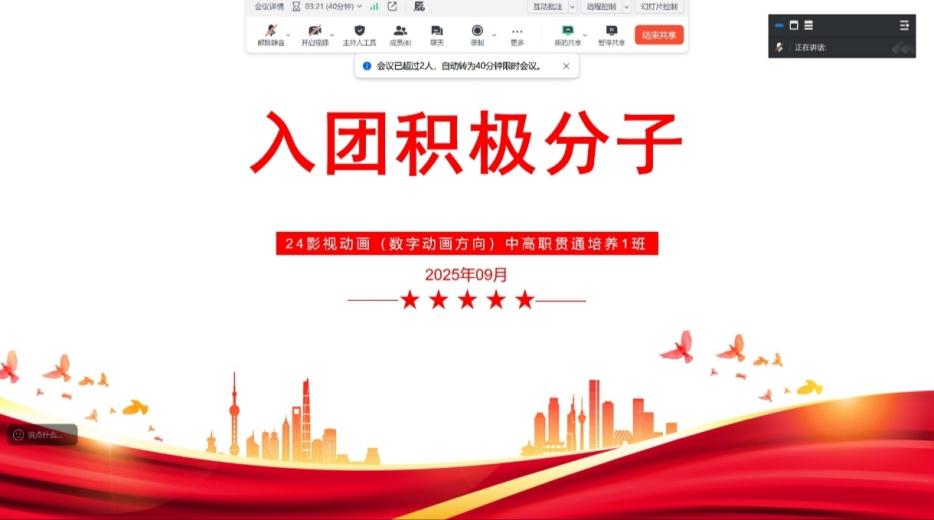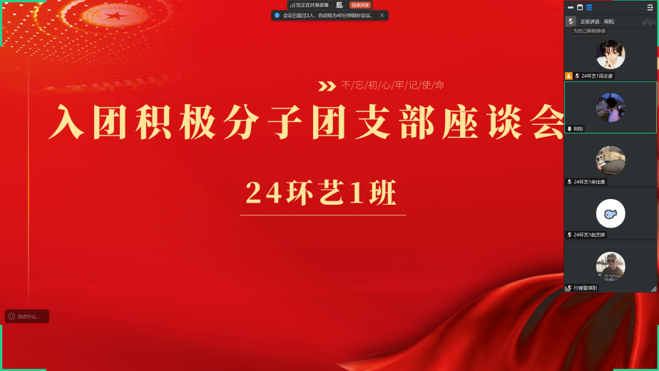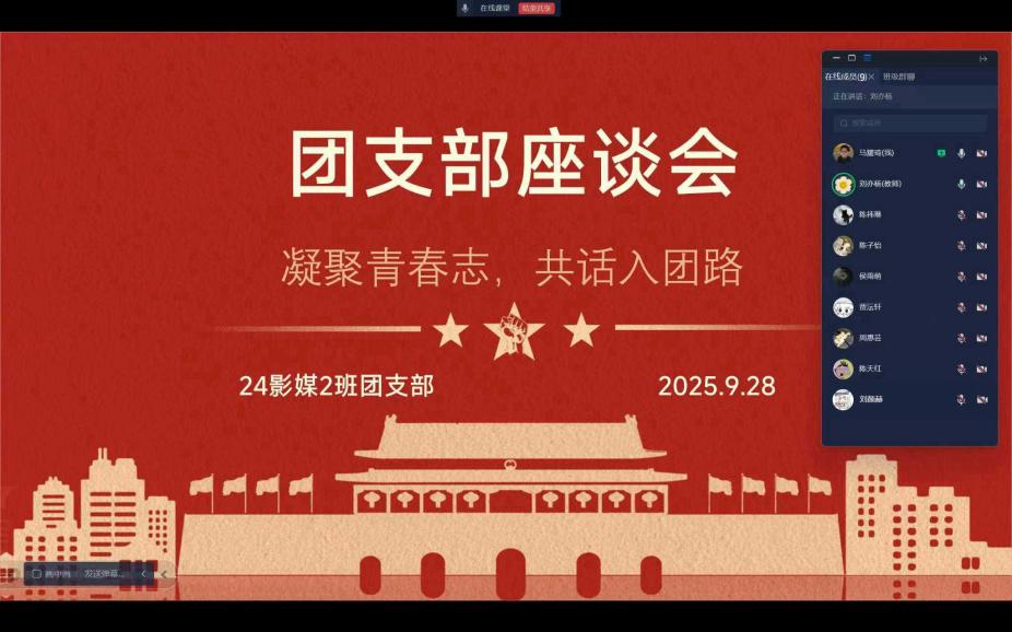 座谈会分班级有序开展,各班级入团积极分子围绕入团动机、理论学习感悟、日常表现及未来规划展开分享。24级环境艺术设计1班的座谈会上,同学们结合志愿服务经历讲述奉献初心;24级影视多媒体2班的座谈会上,同学们聚焦专业学习畅谈“以技能报国”的志向,线上互动区氛围热烈有序。