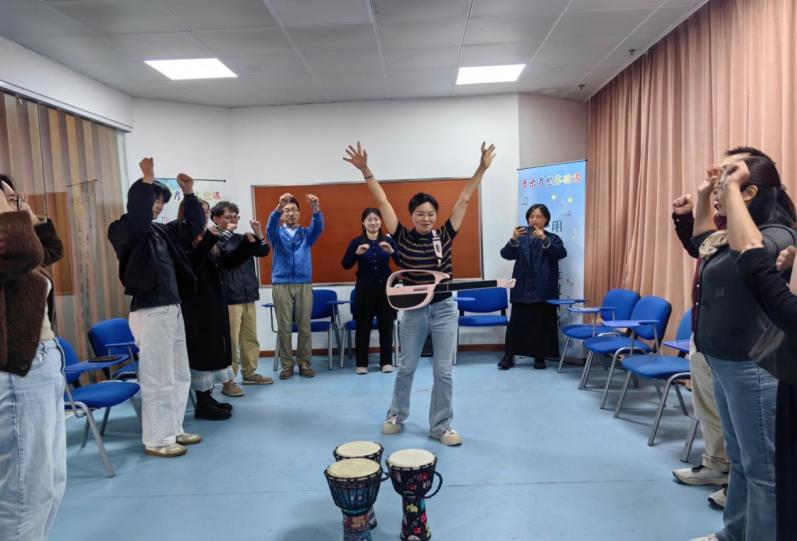 随后,夏老师引导大家进行“身体节奏打击”练习。教师们拿起不同的打击乐器,跟随音乐自由敲击,寻找属于自己的节奏。有人用鼓掌的方式与节奏共振,有人轻敲木鱼、响板、铃鼓,发出层次丰富的音响。现场节奏此起彼伏、和谐流动,仿佛每一次击打都带走了日常的焦虑与疲惫,取而代之的是心灵的放松与情绪的舒展。夏老师鼓励大家用身体去感受音乐的律动,在节奏中释放积压的能量,达到“以音舒心、以乐养心”的效果。