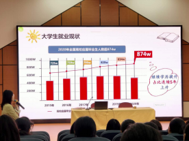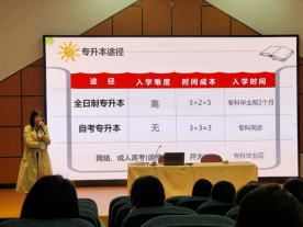 会上,老师统计了班级中有“专升本”意向的同学数量。人各有志,虽然有该意愿的同学占多数,但仍不乏有部分同学并未考虑。与此同时,老师向我们详细讲解了一份本科毕业的文凭,这对于学生的就业是十分重要的,对于同学们的未来人生影响深远,确实应当对此作出一定的准备。 宣讲老师又分别了解了“统考”、“自考”以及“成教”等途径的专升本之间的区别,并一一分析其中的优劣之处:“统考”含金量最高,但是相对来说由于名额和难度的限制,同学们要付出极大的努力才能达成这一目标;而“自考”则为更多同学提供了进入大学的机会,在为“自考”准备的同时,我们的努力也是为“统考”而做着准备。在大家成功获得其中一项或多项“专升本”的机会后,更是对我们的未来提供了更优越的学习条件,在将来的职业竞争中可占得一席之地。这些都为我们刚从高中步入大学的同学们提供了巨大的帮助,相信更多的同学在听完后会对未来三年有更高的自我目标和规划。此次讲座为学生们普及专升本的途径、条件、基本流程、考试科目为同学们答疑解惑。主讲老师给同学们分析了现今社会的就业趋势,强调了更高的知识水平可以提高同学们自身的就业率和发展空间,也详细地讲解了专升本所需要的准备和注意事项。