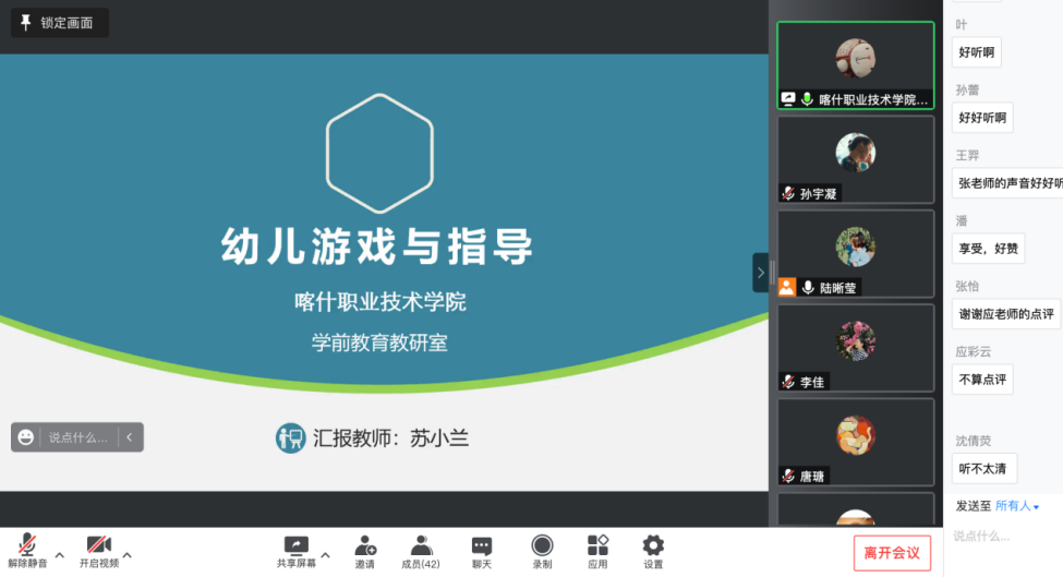 随后,喀什职业技术学院学前教育教研室高莹洁老师介绍了她如何在《学前教育学》的课程中使理论知识和学前教师职业素质之间相融合,并提出了在教学设计和实施中所遇到的困惑,即如何在课程中进行学生思政理念的提升与培养?针对这一问题,双方教师进行了热切交流与研讨。我系同样教授《学前教育学》课程的舒仙桃老师分享了她在这门课程中的思政教学方法,即利用学生下园实践的过程,布置课程思政的作业,让学生在实践中体会课程思政的教学效果。