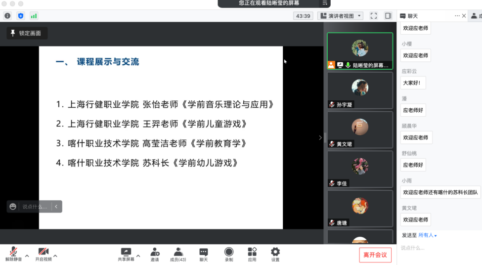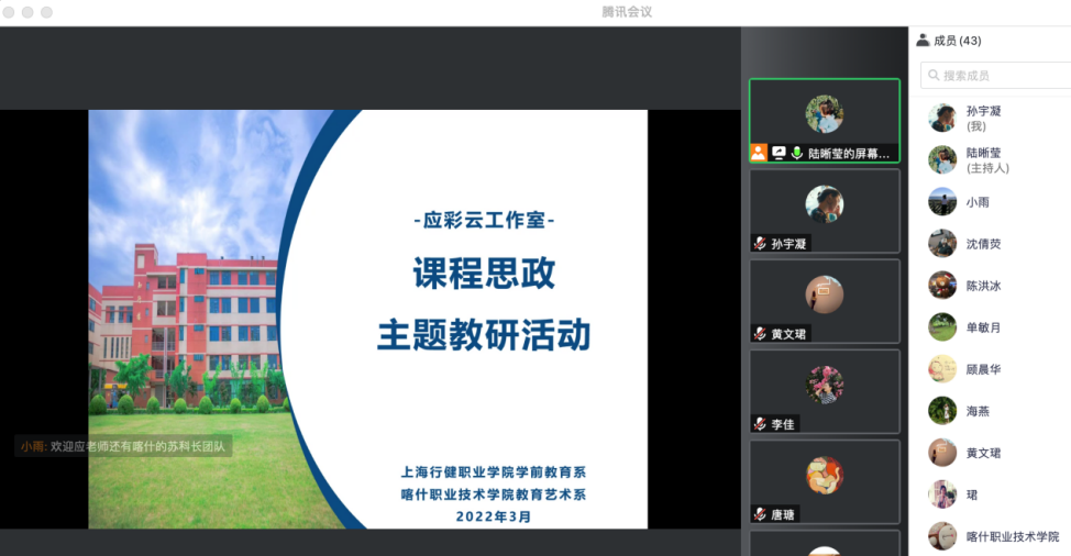 为深入贯彻《高等学校课程思政建设指导纲要》精神,落实新时代立德树人的根本任务,充分挖掘课程思想政治资源,发挥课程育人的积极作用,进一步深化教育教学创新改革,3月25日下午1时,学前教育系举行了以课程思政为主题的应彩云大师工作室线上教学研讨活动。因此,本次会议特邀教学经验丰富的全国教书育人楷模、上海市特级教师应彩云参会,学前教育系主任李娜、党支部书记毛娅君及学前教育系全体教师线上参加本次研讨活动。同时,为助力新疆喀什地区职业教育发展,援建单位喀什职业技术学院教育艺术系教务科负责人苏小兰、学前教育教研室教师高莹洁参与了本次线上会议,全程进行了互动学习与深入交流。