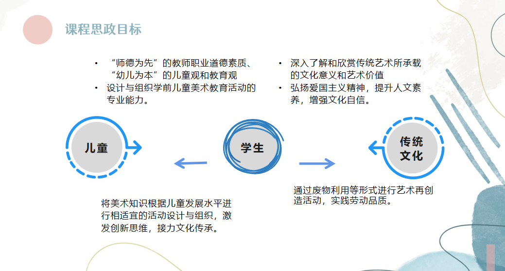 《学前儿童美术教育》以传统艺术为纽带,融合“师德为先、幼儿为本”的教师职业道德素质,重视对学生的道德素质、文化认同、社会责任感的培养,以立德树人、人文熏陶、职业理念为一体,实现全方位育人。教学过程中把课程思政贯穿教育教学全过程、更加注重以文化人和以文育人,实现全过程育人。