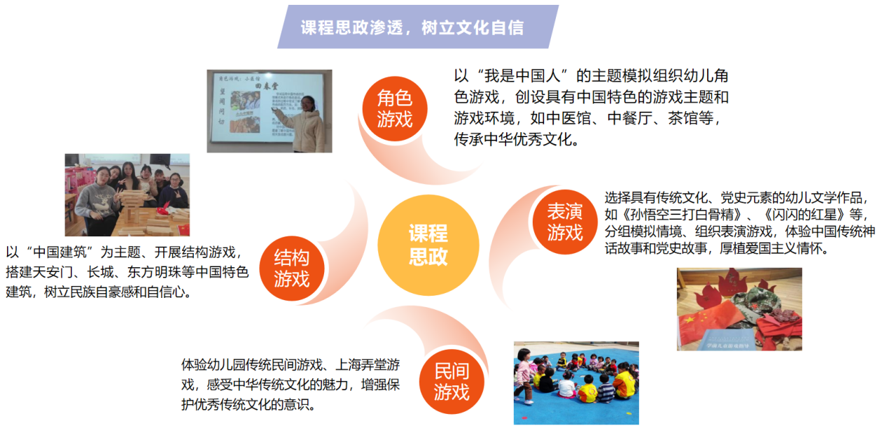 《学前儿童游戏》课程在课程思政融入课堂教学中,深入挖掘课程思政元素,强调师德为先、德技并修,引导学生以师德育师心,以师心润童心;并树立文化自信,课堂教学融入传统文化,树立民族自豪感和自信心,厚植爱国主义情怀。鼓励学生在未来的幼教工作中,将传统文化传承发扬。