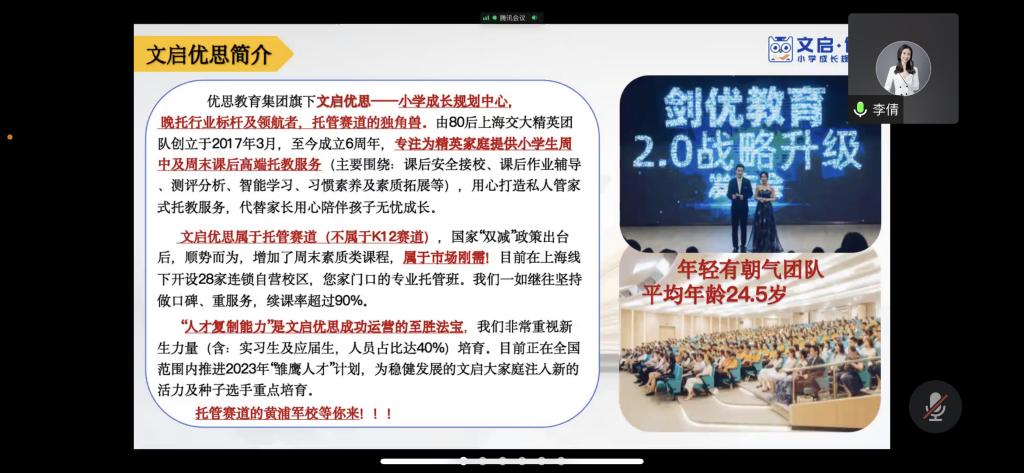 优思教育集团创办于2013年,目前在沪共有28所分支机构,800多名职工。本次专场招聘会涵盖了课程研发、行政管理等多个岗位,预计招募70多名学生。会上公司HR李老师也对公司背景、公司理念、未来目标进行的细致的讲解。对于招聘岗位、岗位职责、福利待遇也一一作了介绍。学生们也可以在实习至转正后根据自己的兴趣和特长选择合适的岗位,让学生对工作能抱有更大的热忱。
