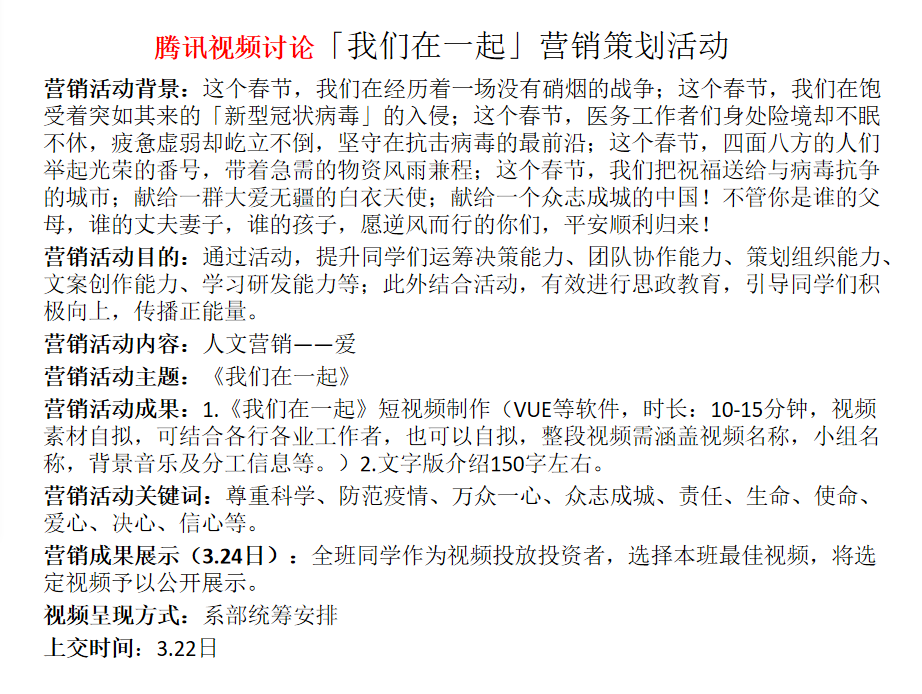3月17-24日,经管系开展“我们在一起”营销策划与实务课程实训,此次实训课程以抗击疫情、众志成城,“我们在一起”主题视频制作为活动内容,借助学习通、腾讯会议、微信群等平台进行实践活动,提升同学们运筹决策能力、团队协作能力、策划组织能力、文案创作能力、学习研发能力等;此外结合活动主题,有效进行思政教育,引导同学们积极向上,传播正能量。