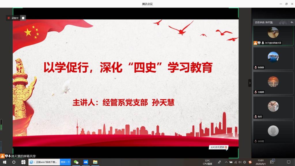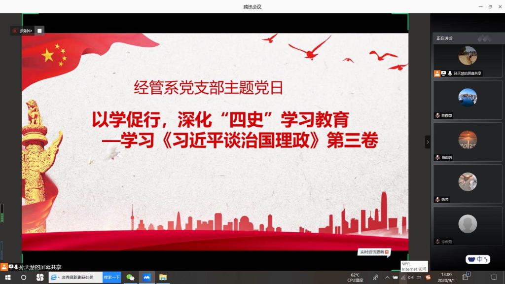 根据静安区教育党工委组织科《关于“四史”学习教育近期工作提示》的部署,近日,经管系党支部以“以学促行,深化‘四史’学习教育”为主题,围绕学习《习近平谈治国理政》第三卷,开展线上主题党日活动。本次主题党日主要采用主题党课的形式,主讲人为经管系党支部书记孙天慧,经管系党支部全体党员参加会议。