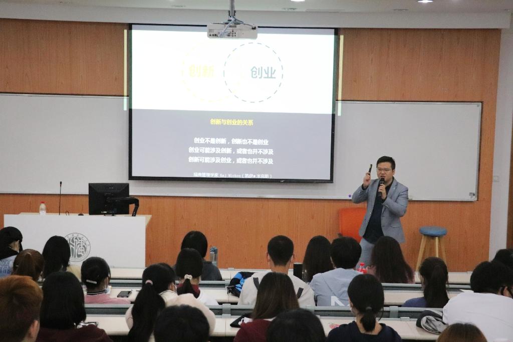 本次活动的讲座以“创新创业我该怎么选”为主题,丁老师结合自己多年的创业及培训经验分别将创新及创业的概念模式以独特的视角与学生进行了很好地互动与沟通,同时也结合“双十一”等当下热点话题展示了创业的独特魅力。丁老师风趣幽默的讲授风格深受同学们的欢迎,现场互动热烈。