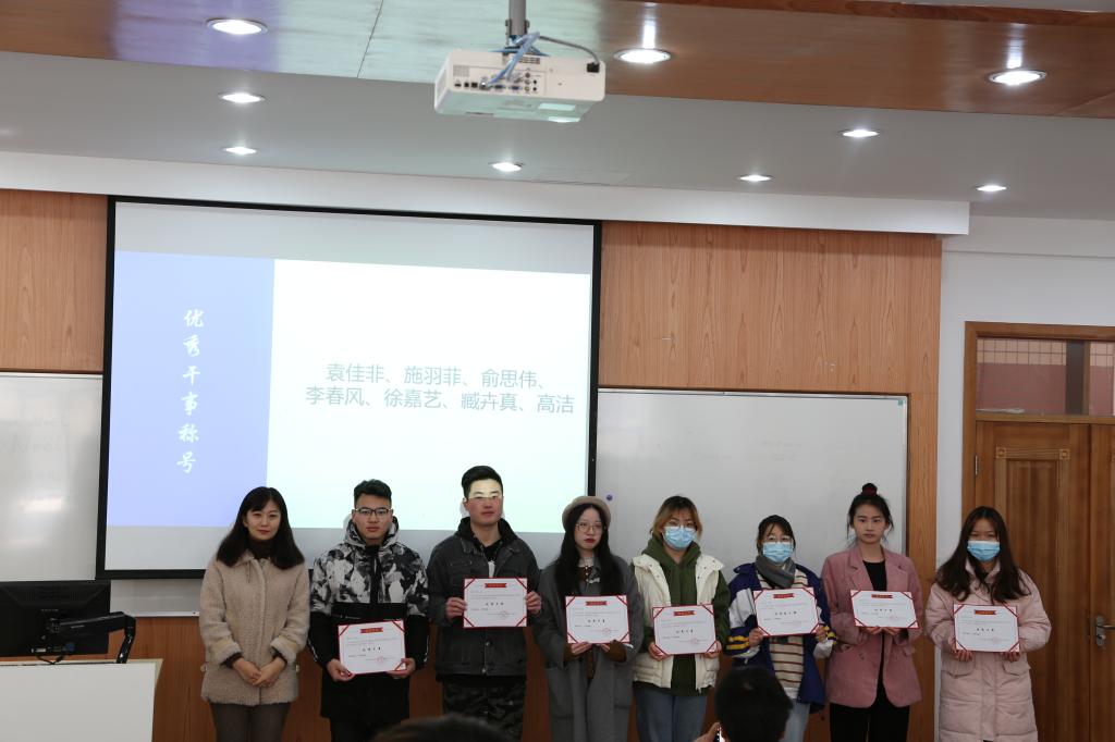 会上,孙天慧书记发表致辞,她在致辞中对学生会一年来的工作给予充分的肯定,同时希望同学们增强机遇观、格局观,处理好学习与工作的关系、继承与创新的关系,发挥好学生会成员自身模范带头作用。李易菲副主席对经管系团总支学生会作总结,分别从学生会队伍建设、团学活动、培训学习、志愿服务、社团活动、所获成绩等方面进行回顾,2020年经管系团总支被选树为“静安区五四红旗团组织”称号,这都离不开经管系全体师生过去一年的辛勤付出和努力。总结会上为袁佳非等7名学生会干事在工作中的突出表现给予表彰并颁发证书。