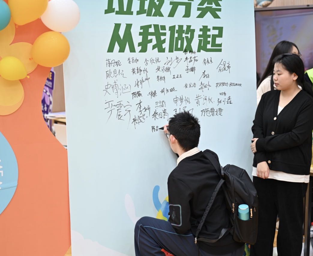 在学院的实训室里,一块写有“垃圾分类 从我做起”的巨型KT板格外醒目,成为学院的“网红打卡点”。活动期间,每天都有学生自愿在KT板上郑重签下自己的名字,以签名承诺的方式表达践行垃圾分类的决心。