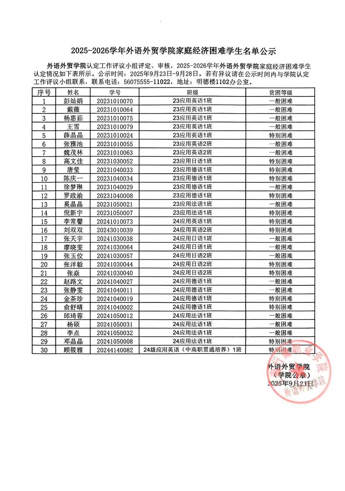 2025-2026学年外语外贸学院家庭经济困难学生名单公示