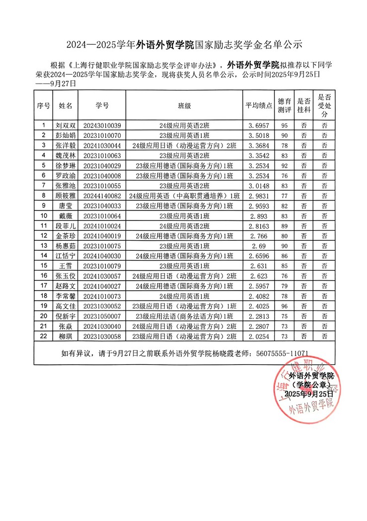 2024—2025学年外语外贸学院国家励志奖学金名单公示