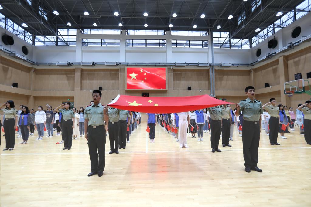 国旗班成员迈着整齐矫健的步伐护卫着鲜艳的五星红旗入场,全体师生齐声高唱国歌,行注目礼,现场庄严肃穆。