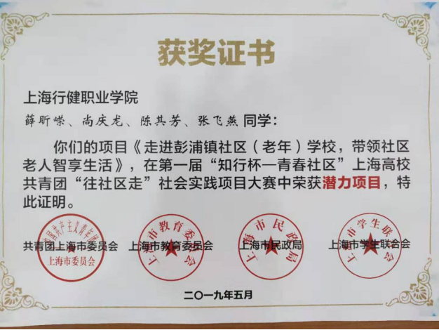 在共青团上海市委员会、上海市教育委员会、上海市民政局、上海市学生联合会联合主办的第一届“知行杯——青春社区”上海高校共青团“往社区走”社会实践项目大赛中,信机系申报的《走进彭浦镇社区(老年)学校,带领社区老人志享生活》志愿服务项目荣获潜力项目荣誉称号。