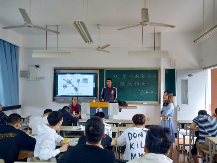 国庆阅兵无上光荣。为欢迎参加国庆70周年阅兵归来的叶雨豪同学,10月14日下午,17级汽车班全体同学在7304举行欢迎会。