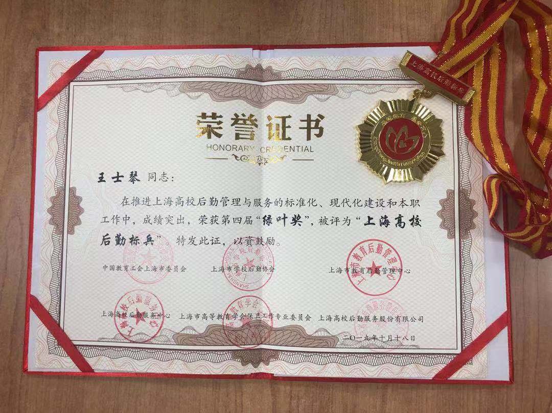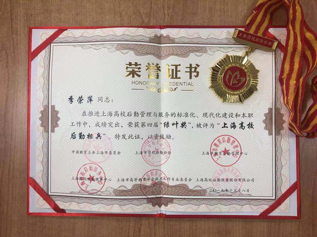 “上海高校后勤标兵”“上海高校校园卫士”(绿叶奖)由中国教育工会上海市委员会、上海市学校后勤协会、上海市教育后勤管理中心、上海市高等教育学会保卫工作专业委员会、上海高校后勤服务股份有限公司联合主办,旨在表彰长期以来在高校后勤战线默默无闻、勤奋工作的后勤先进干部员工,树先进、立典型,从而激励广大干部员工为教学、科研和师生提供更优质的服务。