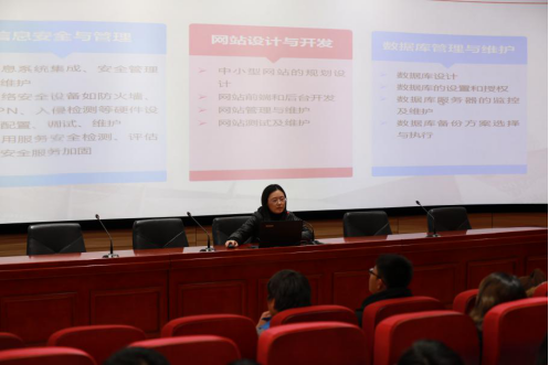在信机系老师带领下,来访师生一行参观了图书馆、信息中心、实训楼等学习场所。在第三届“精于工 匠于心”——信机人技能大比拼比赛现场,来访师生一行观摩了比赛,现场进行了双绞线电缆制作比拼。参观结束后,我院信机系教师和来访师生进行了交流互动。交流中,王莹主任首先对市北职高同学们的到来表示热烈欢迎,并就学院的校训、校风、教风、学风进行介绍。计算机网络技术专业教研室主任杨柳老师对网络专业的办学情况、中高职贯通培养计划及专业就业前景等进行了讲解。原15网络专业学生、现任上海顶逸科技有限公司助理工程师须阳和原17网络贯通专业、现任上海泛翔网络科技有限公司驻场工程师何雨与同学们进行了交流,鼓励学弟学妹们夯实专业基础知识,以更加饱满的状态投入今后的学习和工作中。