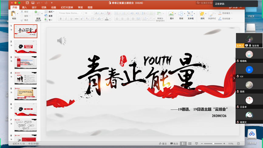 18英语1、2班学生在邢艺老师的带领下了解了当前国内国际抗疫现状;学习抗疫期间“90后、00后”为代表的青年一代挺身而出、奉献担当的事迹,诠释青年大学生的责任和担当;讨论线上学习如何真正做到“防疫不停学,学习不延期”;邀请亲身经历此次防疫支援工作翟诺杰、韩子佳两位同学进行分享,其他同学也积极参与讨论,对如何更好的进行线上学习发表看法。