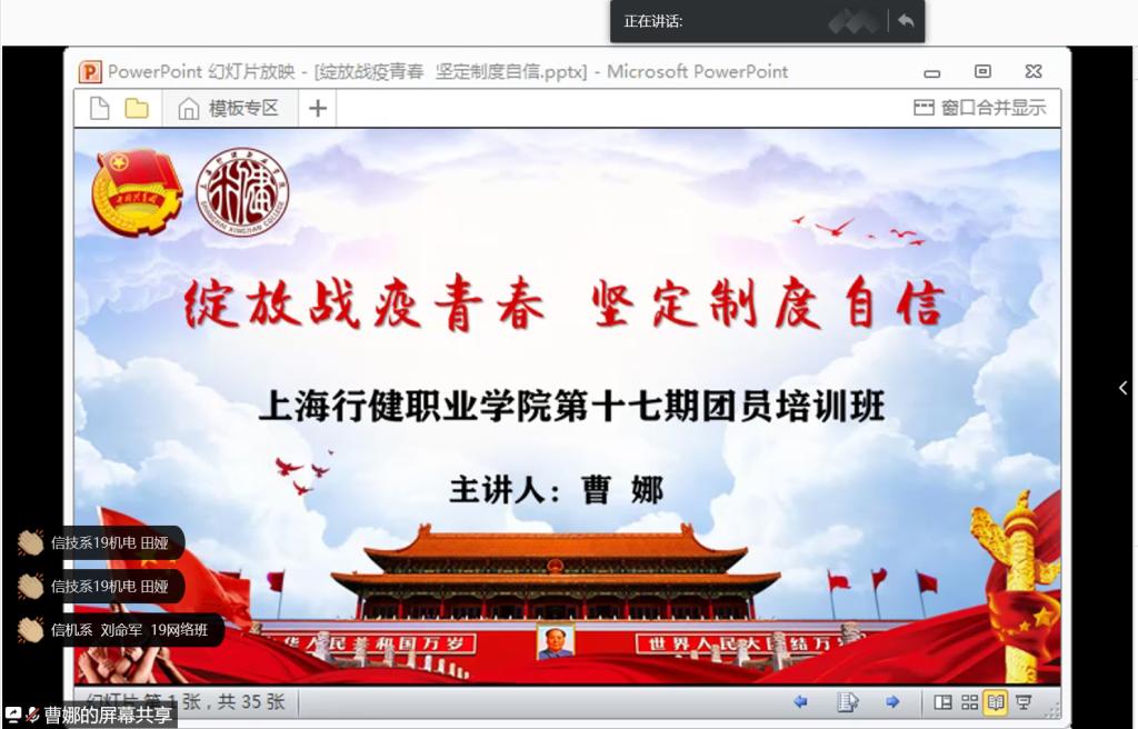 本期培训班开班仪式共分为四个部分。仪式开始,全体培训班学员隔着屏幕起立一齐奏唱国歌。信机系19软件2班陈昊同学作为培训班学员代表发言,立志将以身作则、持续奋斗,把所学融入到日常的学习工作中。开班仪式中,团委书记曹娜老师就开班准备、开班目的及学员推选方式等方面做了筹备情况报告,希望学员们坚定“四个自信”,胸怀共产主义远大理想,积极进取,顺利完成普通人向政治人的转变。最后,全体学员“云端”齐唱团歌结束开班仪式。