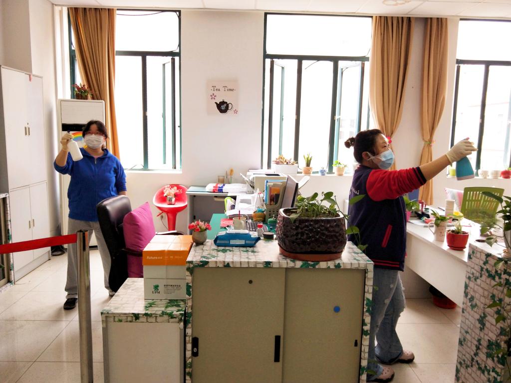为进一步做好新冠肺炎疫情防控工作,为广大读者营造一个健康、温馨、安全的借阅环境,根据《图书馆疫情防控工作预案》要求,近日,学院图书馆全体馆员在馆长的组织带领下对各馆室展开了全面彻底的清洁消毒工作,重点区域包括书库、信息共享空间、参考咨询室、采编室、教材室等公共区域。工作中,图书馆的工作人员不畏脏、不怕累,分工明确、配合默契,对地面、桌椅、书架、藏书、电脑、座机、门把手等用稀释后的84消毒液或酒精棉片进行了喷洒与擦拭。