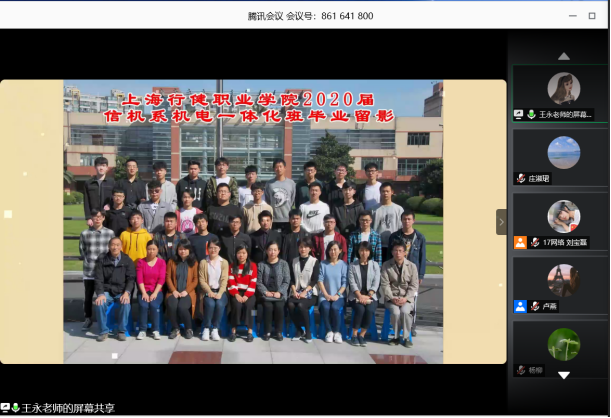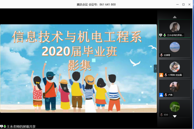 信机系团总支精心收集了2020届毕业生在校三年的学习、生活点滴,制作成了电子相册送给每位毕业生。王永书记在开场致辞中指出,虽然新冠病毒疫情让我们的毕业典礼只能在网上进行,但是学院毕业的骊歌同样为大家唱响,在踏入新的旅程之际,希望大家怀揣初心、勇担使命,成就未来。