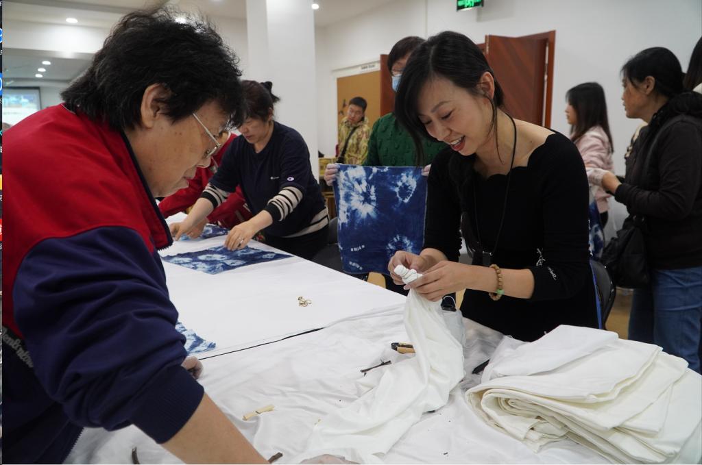 学院应用艺术系专业群主任袁莉莉带来白族扎染非遗技艺,指导学员们从小区就地取材,以石子、树枝、针线为造型工具,巧心设计,捆扎浸染出以传统图案为主,溢满生活情趣的作品,为生活增添优美动人的色彩。